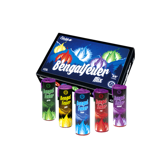 Bengalfeuer im 5er Pack (Rot, Blau, Grün, Gelb und Violett). Intensive Flamme mit starker Licht- und Rauchentwicklung, im kompakten Format mit der maximal in Kateorie F1 zulässigen Satzmenge von 20g und einer Brenndauer von ca. 25 Sekunden. Kategorie F1, ganzjährig frei verkäuflich an Personen ab 12 Jahren.