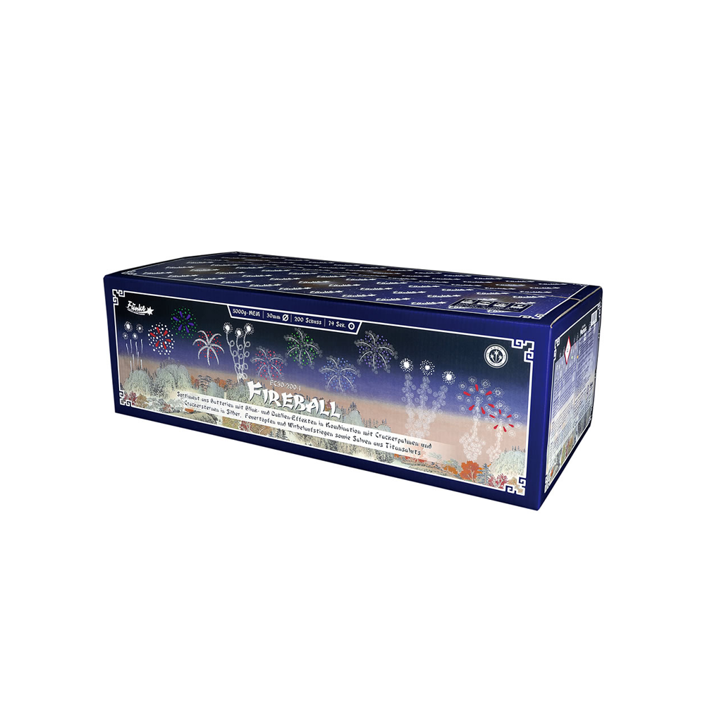 Sortiment aus Verbünden mit Blink- und Dahlien-Effekten in Kombination mit Crackerpalmen und Crackersternen in Silber, Feuertöpfen und Wirbelaufstiegen sowie Salven aus Titansaluts.