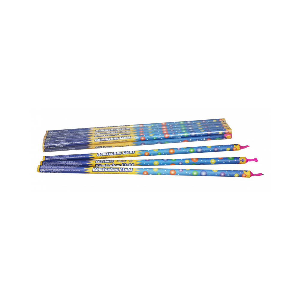 Klassische Römische Lichter im 10er Pack, mit je 20 im Wechsel geschossenen Leuchtkugeln in Violett, Gelb, Blau, Grün und Rot.