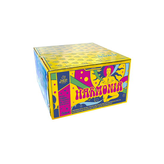 Showbox with color, strobe and crackling chrysanthemum effects in alternating shapes and almost 1.000g powderweight.