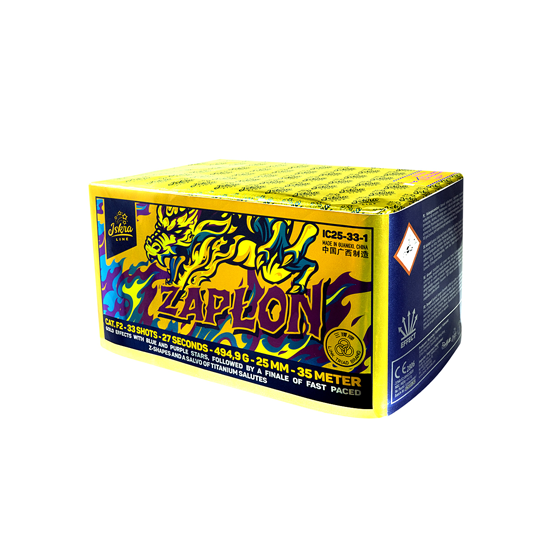 33 Schuss im Kaliber 25mm. Goldeffekte mit Farbsternen in Blau und Purpur, mit Finale aus schnell geschossenem Z-fächer mit abschließender Salve aus Titanfunken-Blitzen.