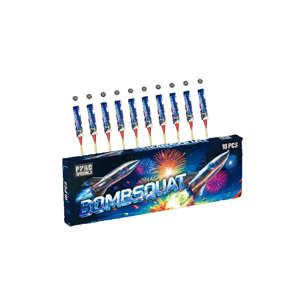 Bombsquat überzeugt mit 10 hochwertigen Shell-Raketen im starken Design. Präzise Aufstiege, saubere Zerleger und satte Farben machen dieses Set zu einer perfekten Wahl für Feuerwerksliebhaber.
