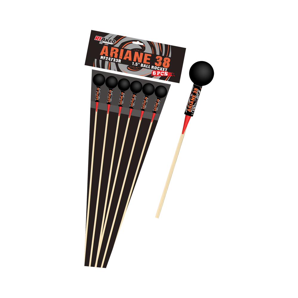 Die Ariane 38 von Riakeo Fireworks ist eine hochwertige Raketen-Set von Riakeo im Kaliber 38mm – bekannt für kräftige Effekte und hohe Qualität. Jede Packung enthält 6 Stück mit je 6 Effekten.