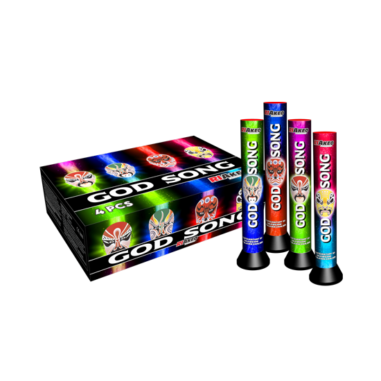 Die God Song Single Shots bieten vier hochwertige unterschiedliche Bukett-Effekte, vornehmlich in edlem Gold begleitet von farbigen Akzenten, jeweils 4 Single Shots im Kaliber 30 mm mit je 25gr NEM.