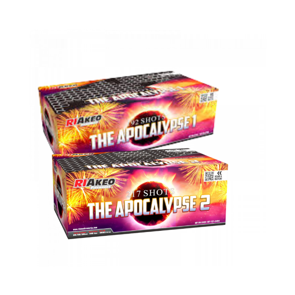 Mit dem Verbundfeuerwerk The Apocalypse 1+ 2 liefert Riakeo ein monumentales Feuerwerkserlebnis, das keine Wünsche offenlässt. Vier perfekt aufeinander abgestimmte Verbunde entfesseln in knapp zwei Minuten eine brachiale Pyro-Inszenierung von 409 Schuss mit abwechslungsreichen Farben, Formen und Klanggewalten.